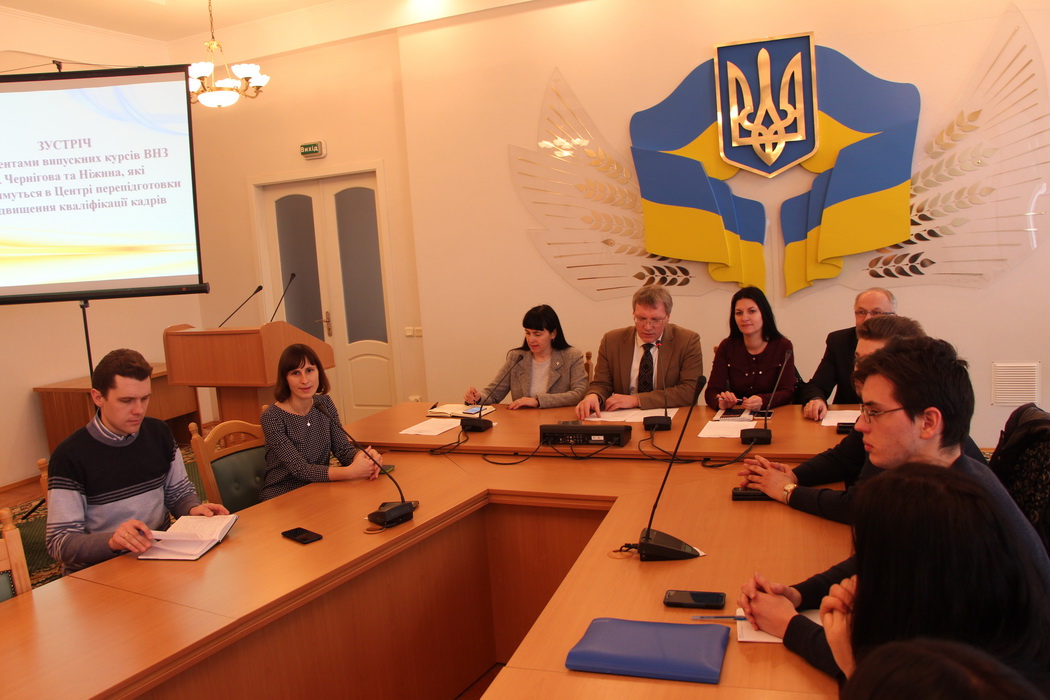 Прагнете робити великі зміни, подбати про власне майбутнє та своєї держави – тоді вам на державну службу! Саме таким гаслом привітали студентів Чернігова та Ніжина представники керівництва області на установчій зустрічі, що традиційно проводиться перед початком семінару «Державна служба та служба в органах місцевого самоврядування в Україні: правовий статус, стиль і методи роботи». Спілкування відбувалося 5 березня 2019 р. в Чернігівському центрі перепідготовки та підвищення кваліфікації кадрів.